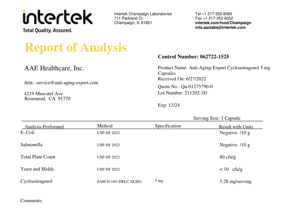 We are professional in R&D. We provide the most effective ingredients of astragalus extracts and the new formula to guarantee the quality and purity of our Cycloastragenol & Astragaloside IV. The purity of Anti-aging-expert® Cycloastragenol & Astragaloside IV is over 98% which is higher then other companies' products. We have our own GMP-certified production facility.